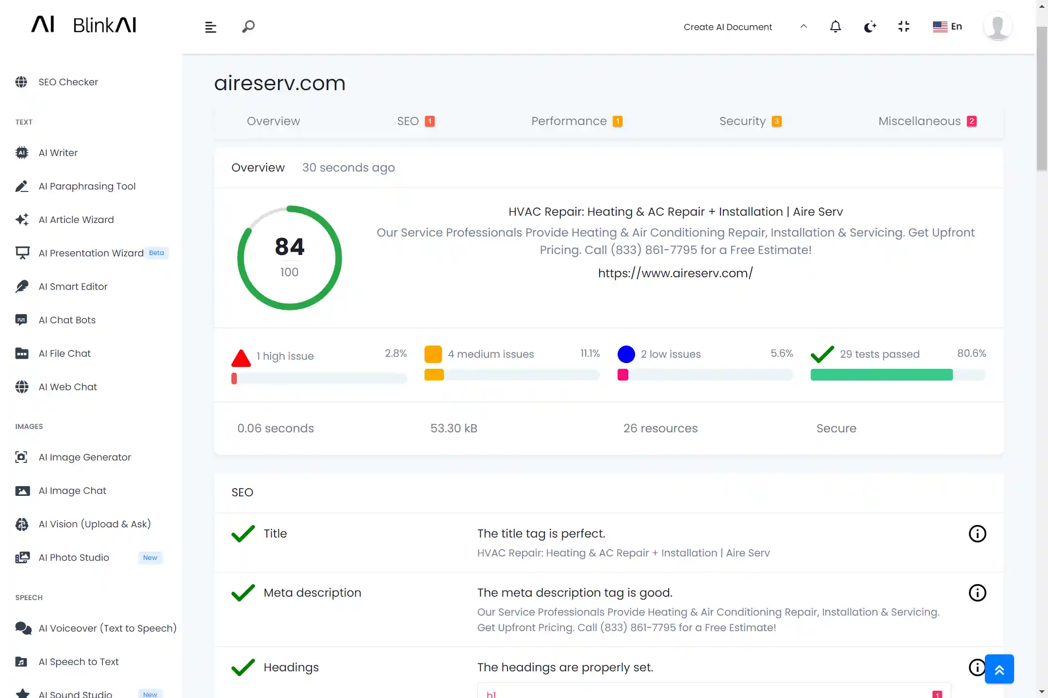 With BlinkAI's powerful SEO checker, you can dive deep into your site’s performance and uncover the technical errors and on-page SEO issues that might be holding you back from top search engine rankings.